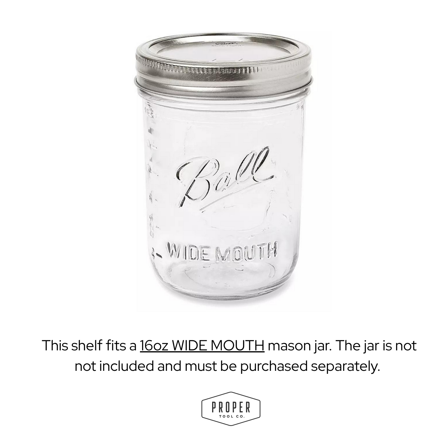 Our Mason Jar Shelf is made to hold a 16oz wide mouth jar, perfect for organizing all corners of your home! Laser-cut from 14 ga mild steel, then precisely bent to shape and powder coated in a matte black finish. **The 16oz wide mouth mason jar is not included and must be purchased separately.