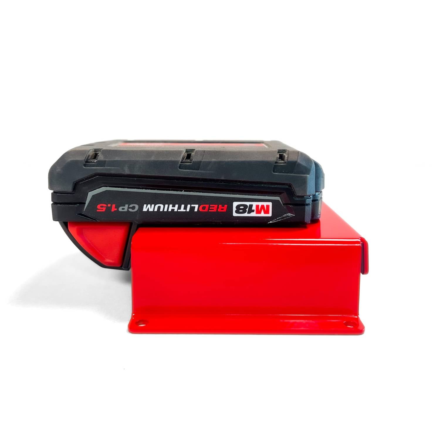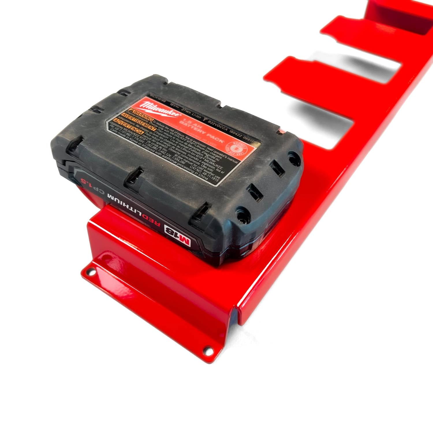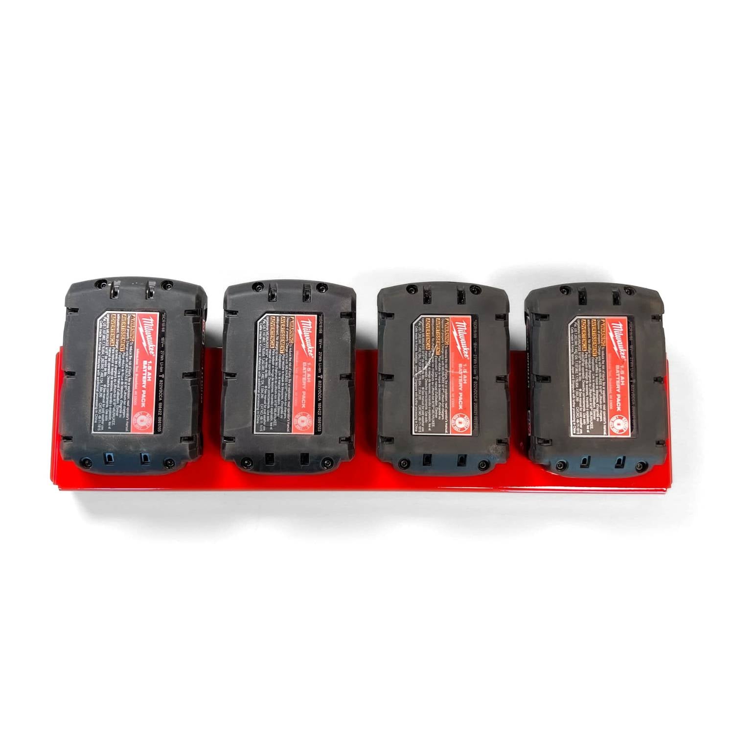 Our Milwaukee M18 Battery Organizer has four slots that lock your drill batteries into place, which guarantees that they won't leave your workspace. Crafted with precision from 14ga steel and powder coated in a striking red finish, this mount is engineered to make your battery storage needs more efficient and convenient. This mount is perfect for the shop, garage, or service truck.
