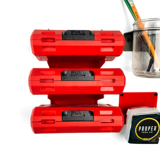 Our custom-designed Universal Drill Bit Shelf is made to fit drill bits, drivers, and accessory cases. This shelf seamlessly holds three cases, completing your workshop's organizational needs. Crafted from durable 14-gauge powder-coated steel. Elevate your workspace and ensure easy access to your essential drill accessories!