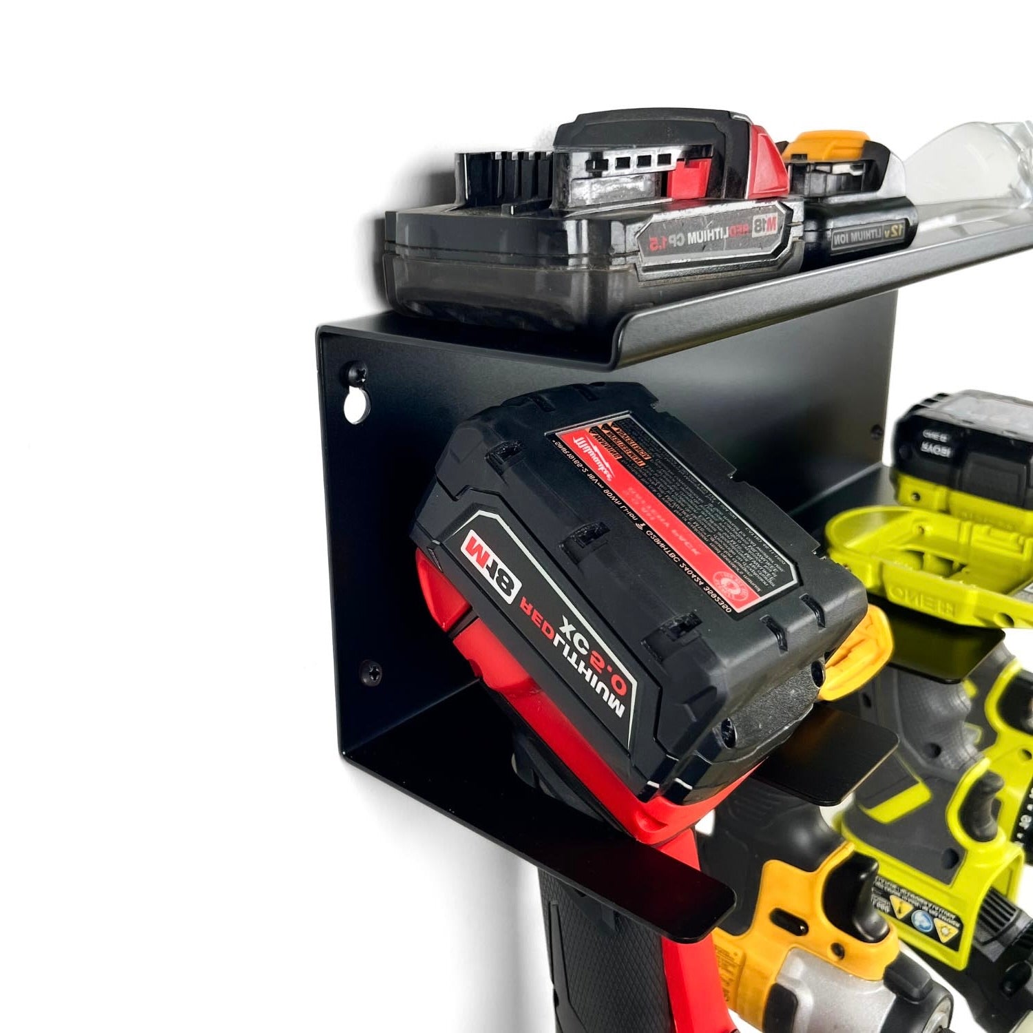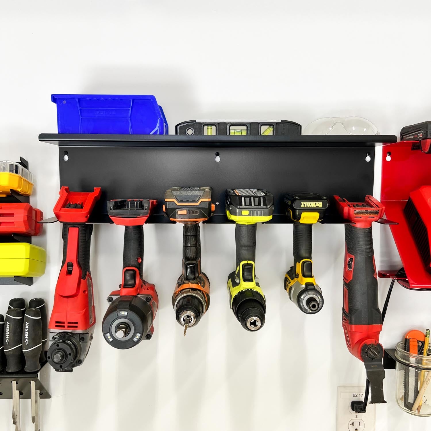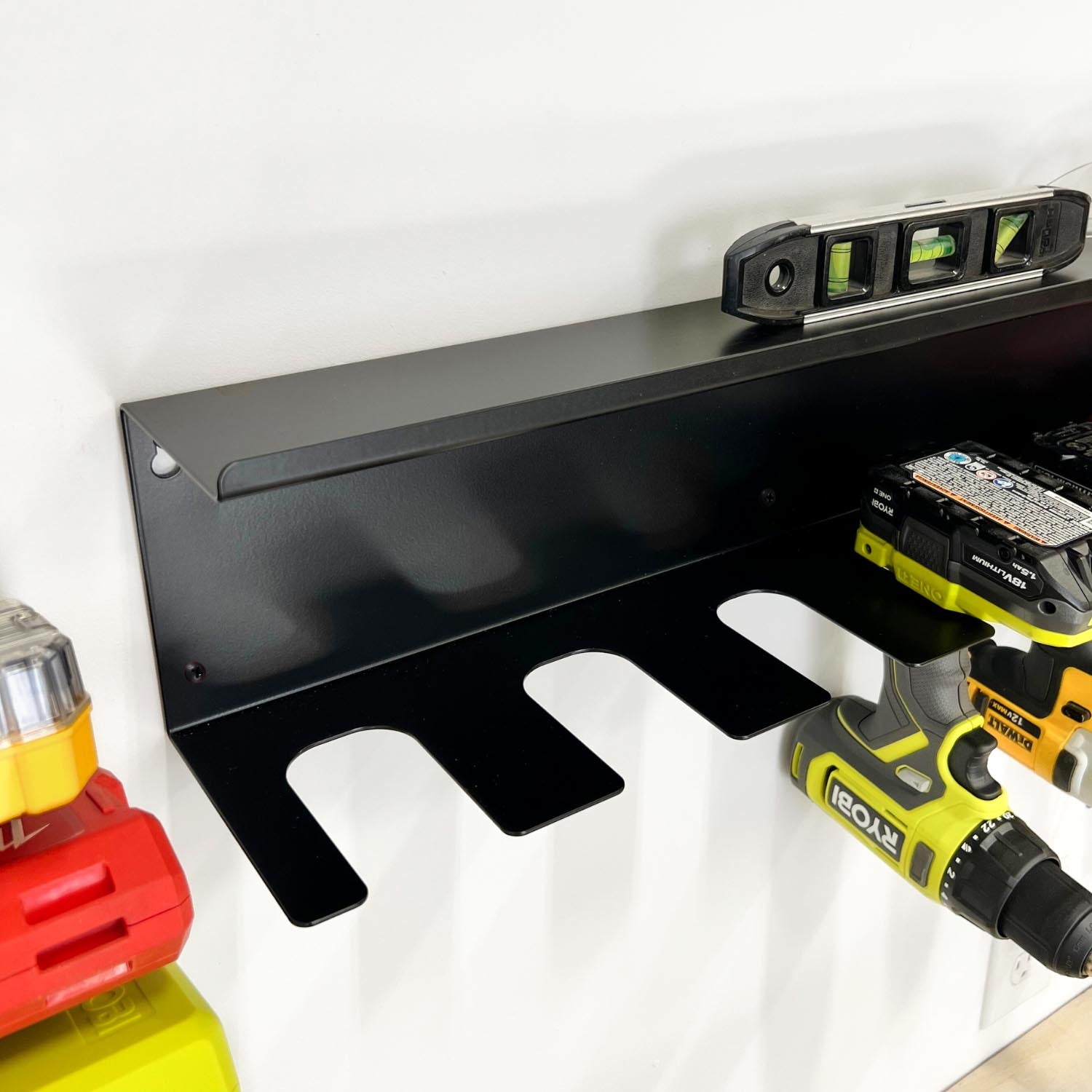 Our Universal Tool Shelf is the ultimate organization solution for both professionals and DIY enthusiasts. Featuring 4 or 6 slots on the bottom, it securely holds drills, impact drivers, and other cordless tools, keeping them within easy reach. The top shelf is perfect for storing drill batteries, tool parts, and accessories like drill bits, ensuring everything you need is organized and accessible. Designed to accommodate products from various brands, this versatile shelf enhances workspace efficiency and helps maintain a clutter-free environment, making it an essential addition to any workshop or garage.