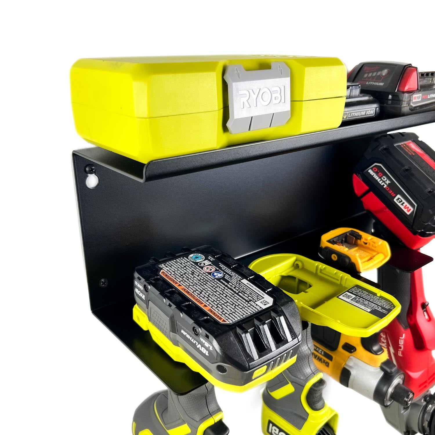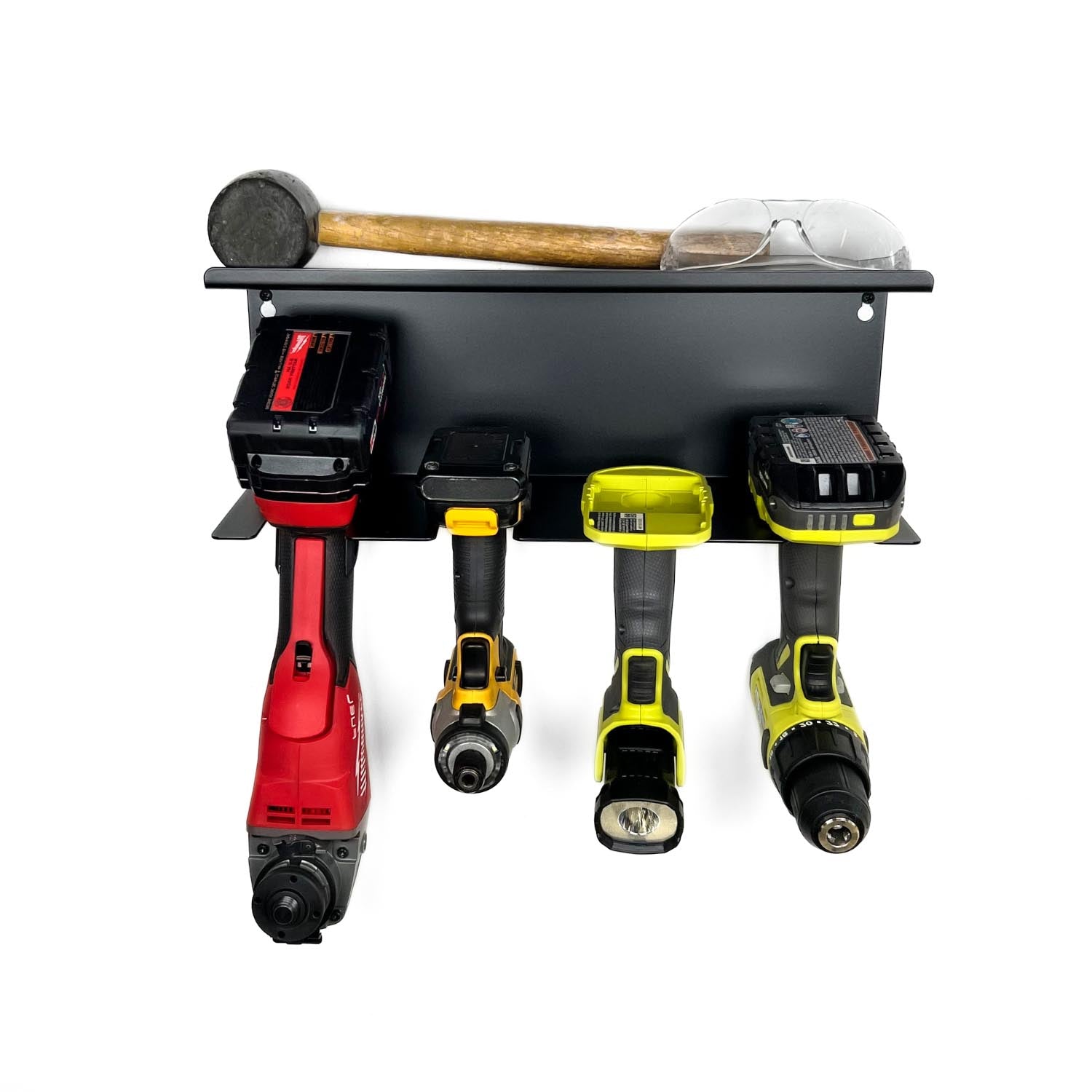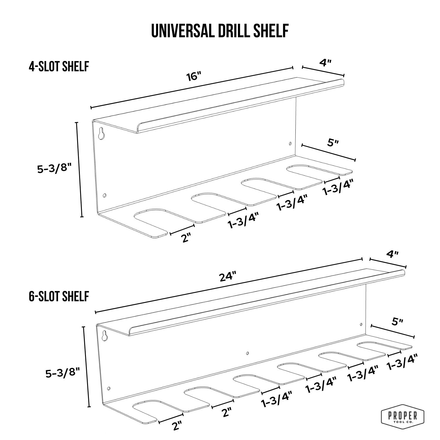 Our Universal Tool Shelf is the ultimate organization solution for both professionals and DIY enthusiasts. Featuring 4 or 6 slots on the bottom, it securely holds drills, impact drivers, and other cordless tools, keeping them within easy reach. The top shelf is perfect for storing drill batteries, tool parts, and accessories like drill bits, ensuring everything you need is organized and accessible. Designed to accommodate products from various brands, this versatile shelf enhances workspace efficiency and helps maintain a clutter-free environment, making it an essential addition to any workshop or garage.